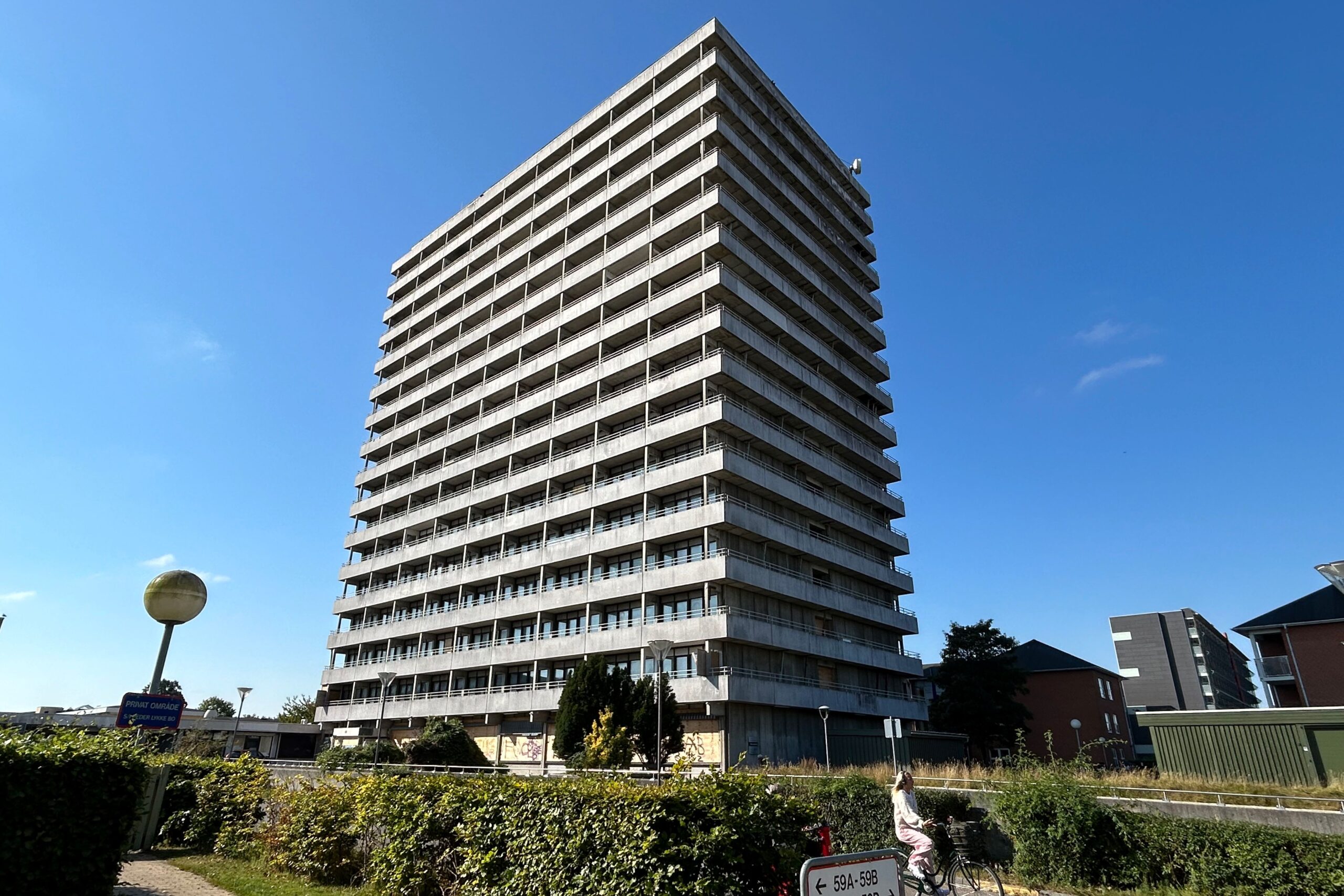I 2022 flyttede de sidste beboere ud af Peder Lykke-højhuset, da det ikke længere var forsvarligt at blive boende. Nu skal en omfattende renovering redde det gamle højhus fra nedrivning. Foto: Domea.dk