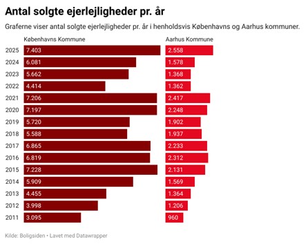 I Københavns Kommune endte ejendomsmæglerne med at sælge 7.403 ejerlejligheder i 2025, mens antallet i Aarhus Kommune var 2.558. Det er i København 22 % flere end i 2024, og i Aarhus er der sket en stigning i salget på 62 % sammenlignet med 2024.