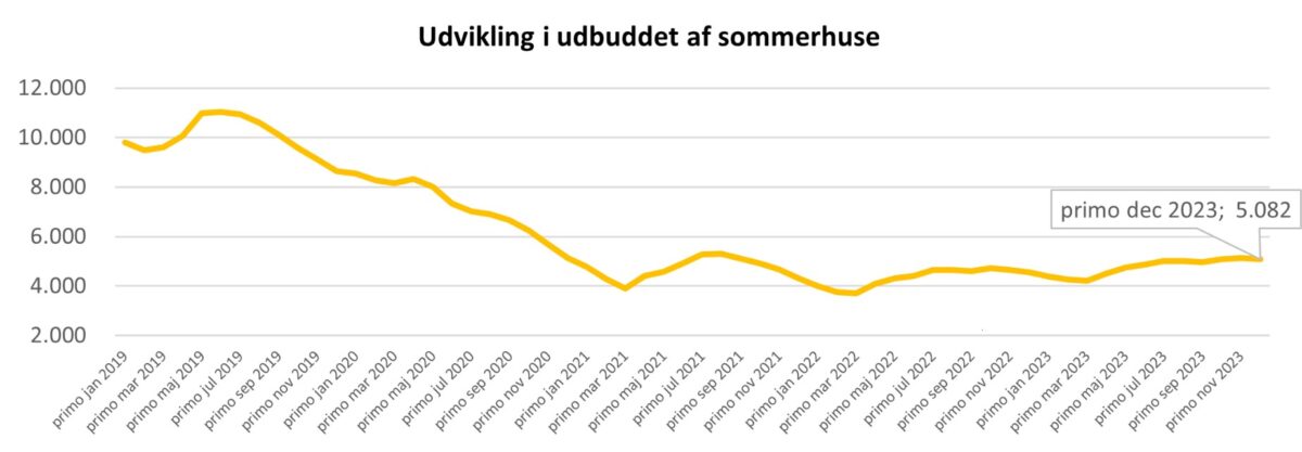 Ved indgangen til januar er der 5.132 sommerhuse til salg i Danmark. Det er ligesom for husene 11,1 % færre, end der var til salg på samme tidspunkt sidste år.