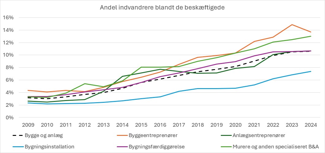 I de 15 år fra 2009 til 2024 har vi nemlig tacklet efterspørgslen efter arbejdskraft gennem indvandring. Antallet af indvandrere beskæftiget i bygge og anlæg er mere end firdoblet i perioden.