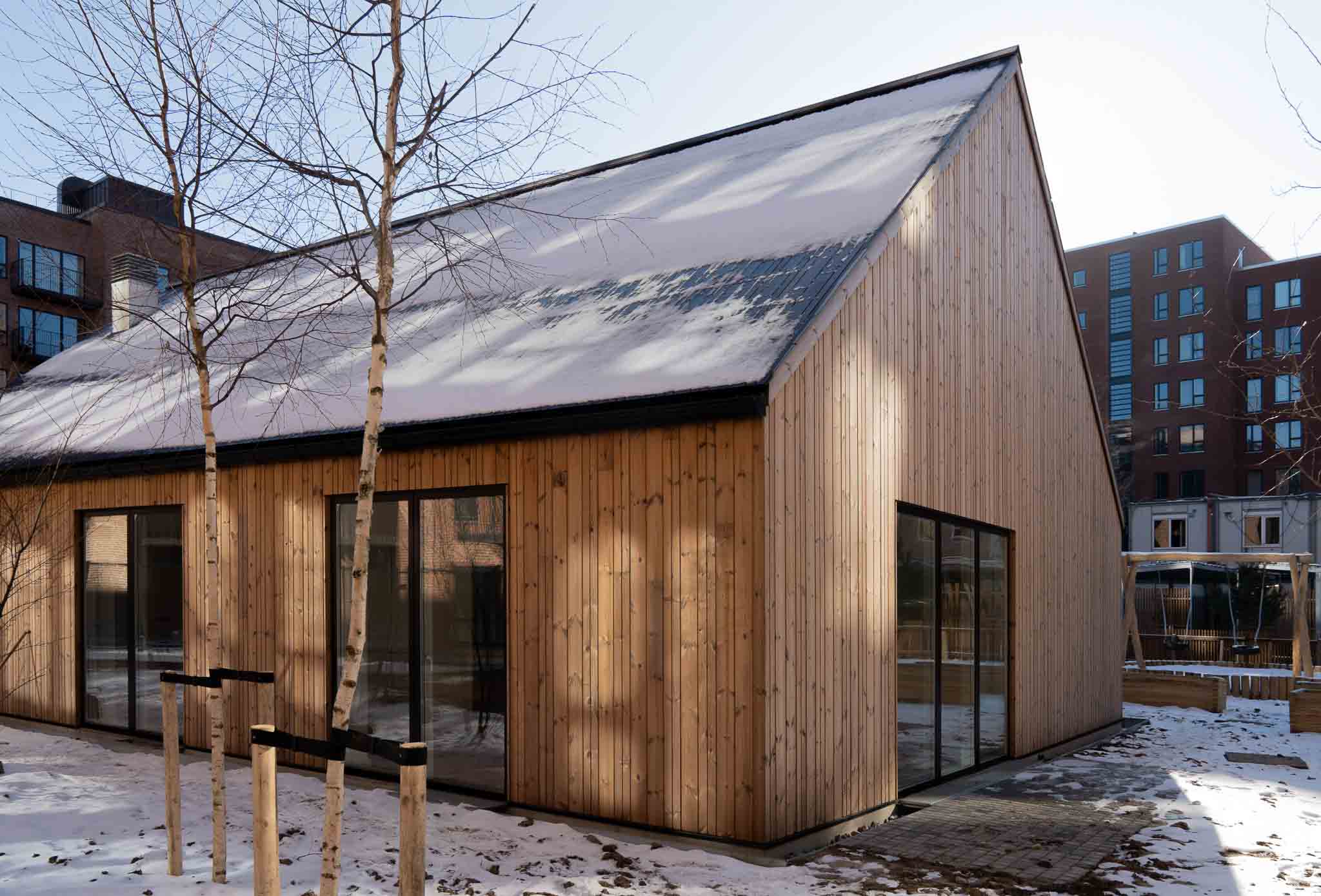 Bronsø Termobehandled Træfacade produceret fra frasorteret træ monteret på Valhøj Skole.