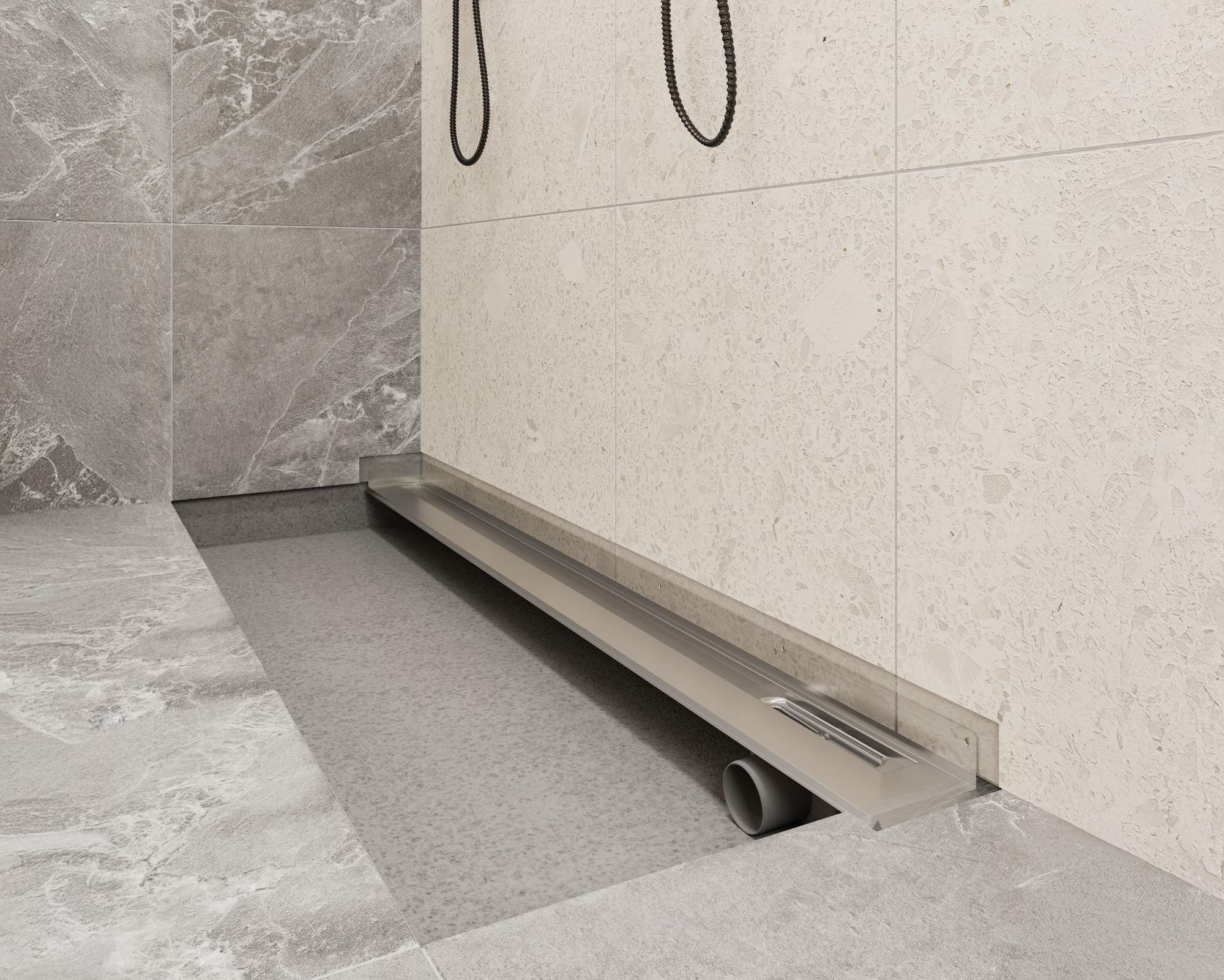 Løsningen blev udviklet i tæt dialog mellem installatøren og Unidrains tekniske afdeling for at sikre nøjagtig pasform og korrekt fald mod afløbet. Den færdige konstruktion blev integreret i gulvets linjer, så den både fungerer teknisk og fremstår som en naturlig del af rummet.